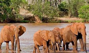 A herd of elephants leaving our water pan having drunk themselves full.